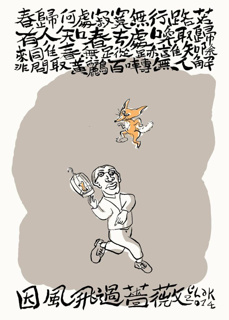 這一篇以黃庭堅的《清平樂》為主線,重點在於兩句:「若有人知春去處,喚取歸來同住」,意謂人皆偏愛春和日麗,走起路來地格外帶勁,猶似圖中的先生 (人本位)和狐狸(獸性的象徵符號),這一位四眼紳士為求朝晚逢春,不惜把歌聲婉轉的小鳥玩弄掌上,期待欣然暢快終日源源不斷。