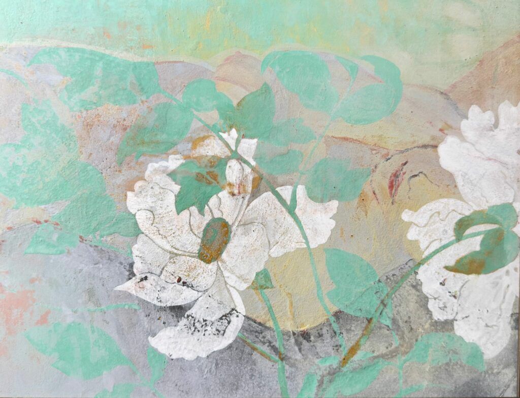 TITLE: LIE DRUNK IN THE FLOWERS ARTIST: ELSA NGAI YEAR: 2024 MEDIUM: MINERAL PIGMENTS ON WOODEN BOARD DIMENSION: 41 x 31.8 cm ITEM DESCRIPTION: SIGNED