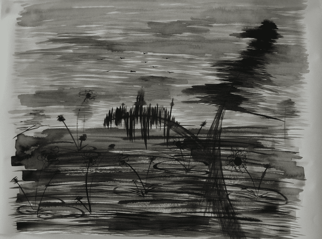 TITLE: BLUE PERIOD: SWAMP ARTIST: IRIS YUNG YEAR: 2024 MEDIUM: INK ON PAPER DIMENSION: 45 x 65 cm EDITION: UNIQUE ITEM DESCRIPTION: SIGNED AND DATED ON THE BACK
